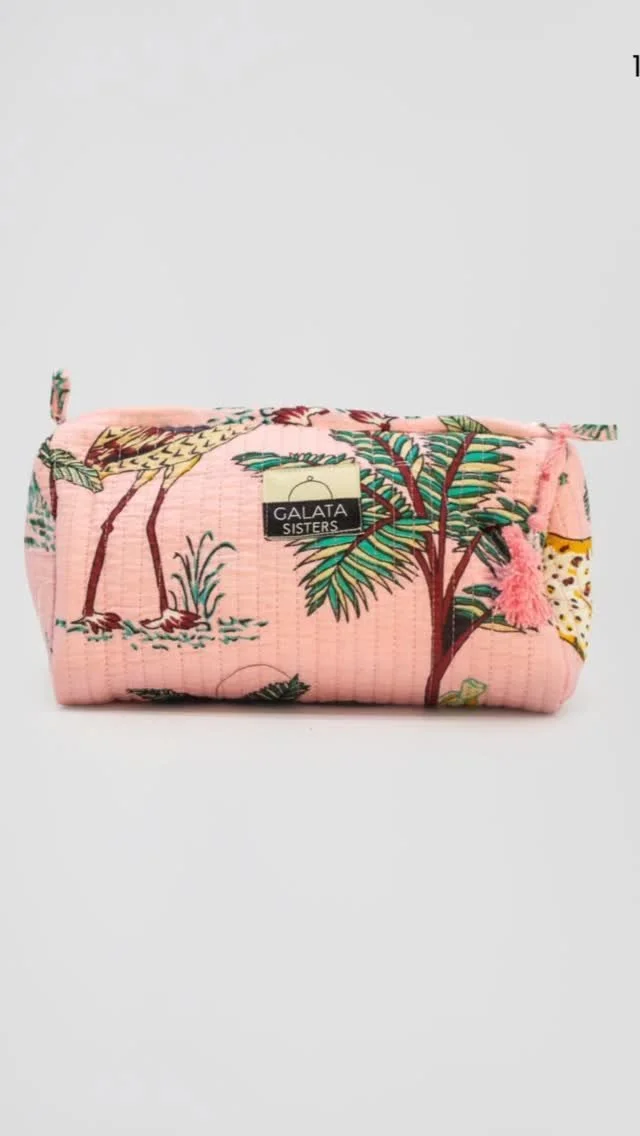 Neceser de algodón 100% con cierre de cremallera y forro interior impermeable.