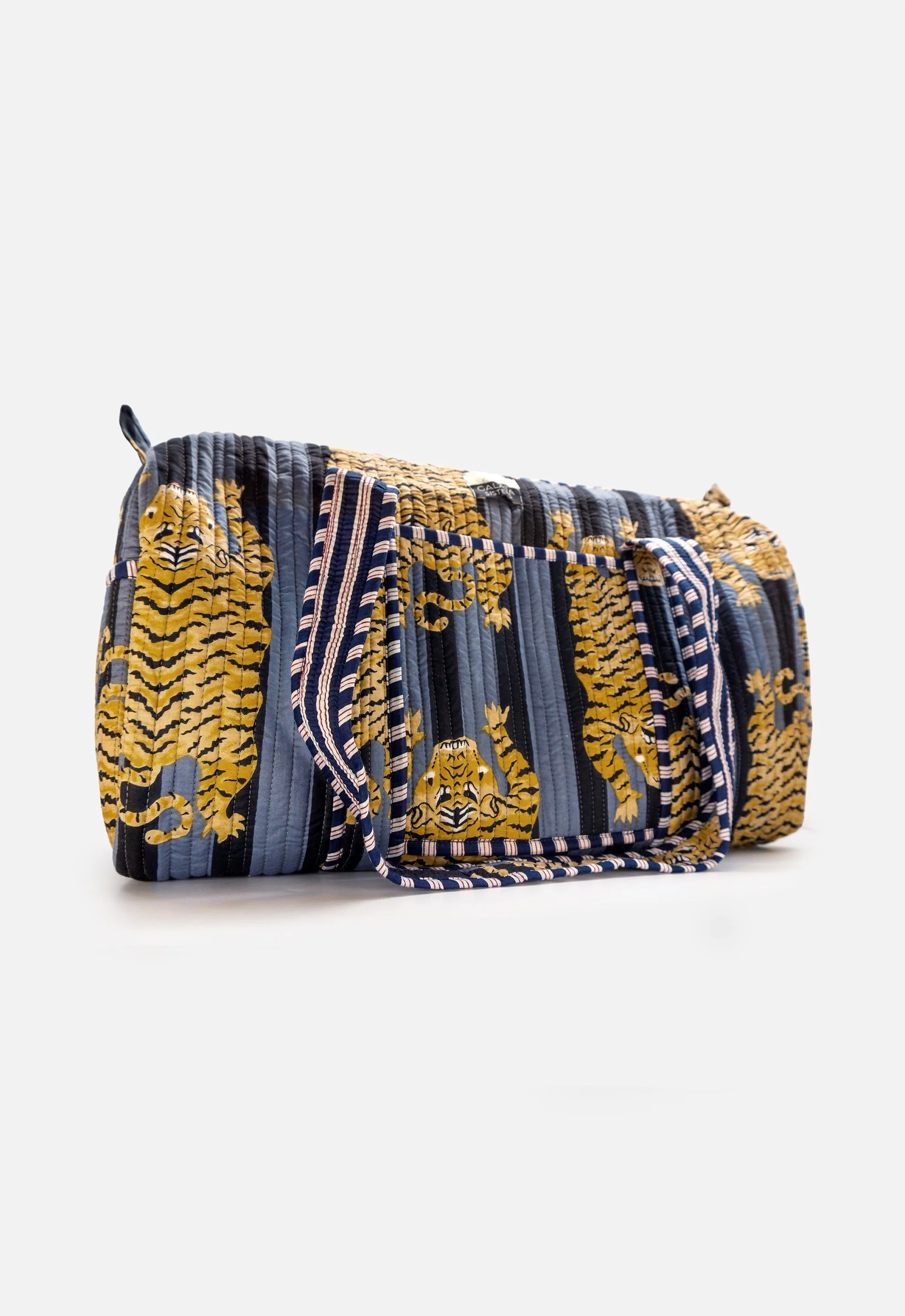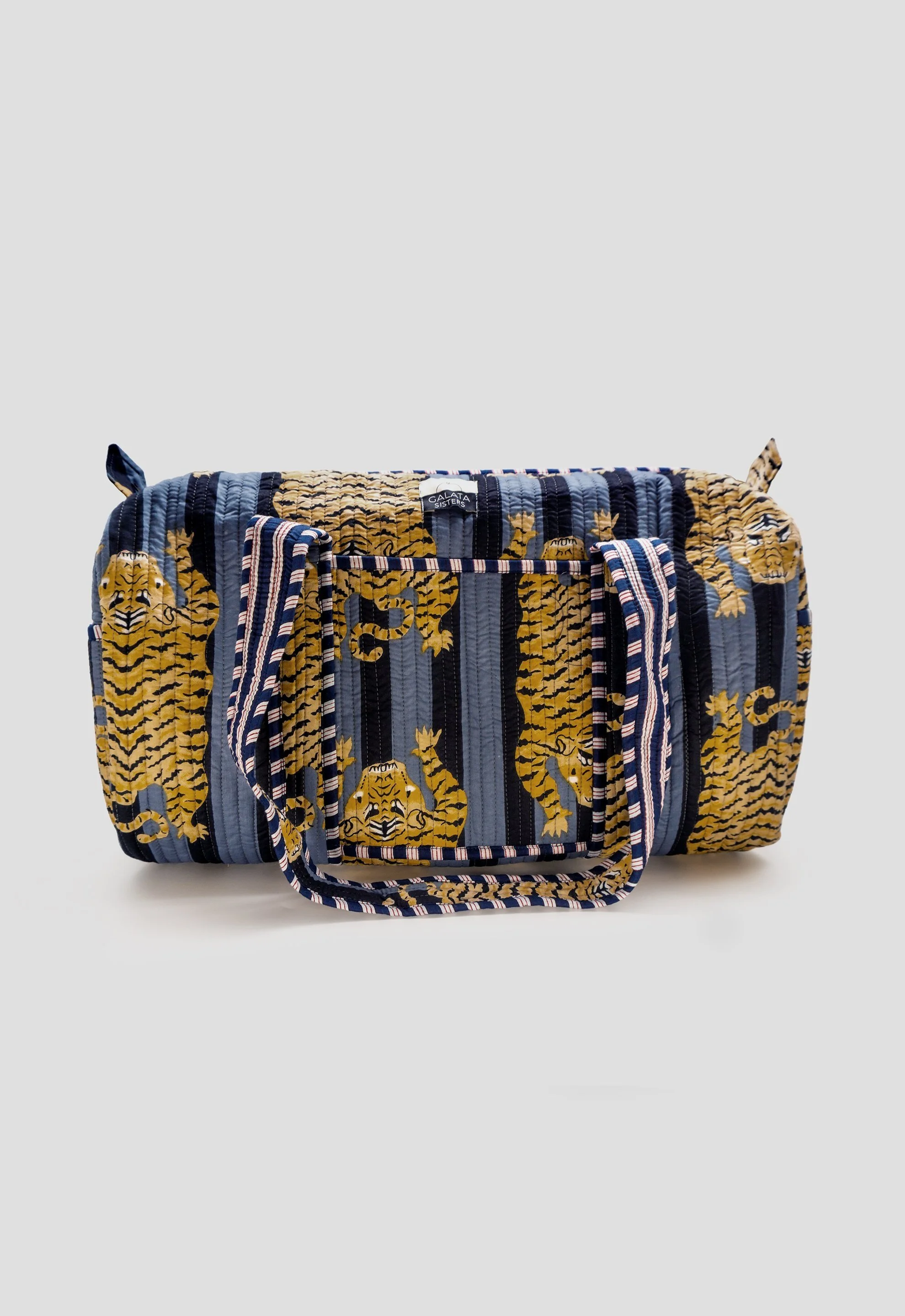Una de las cosas por las que nos sentimos más orgullosas es que cada bolso de fin de semana es único, confeccionado en Jaipur, India. Los artesanos imprimen la tela de algodón con sellos de madera o mediante el proceso de serigrafía, conocido como block printing o screen printing. Posteriormente, el bolso es bordado con la famosa y tradicional técnica Kantha y decorado con nuestro cordón negro Galata Sisters en la cremallera.